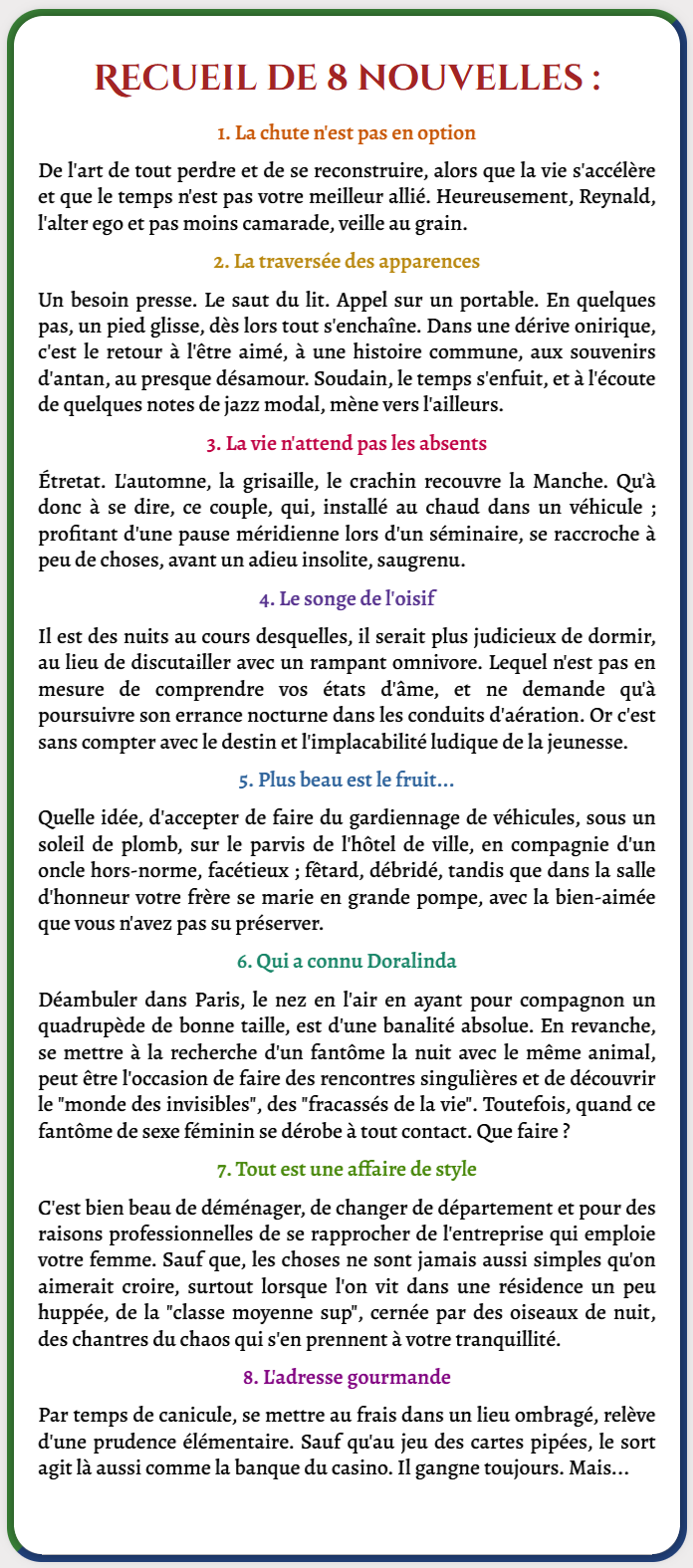 Tout d’abord, bravo pour votre livre. Nous y avons, mon mari et moi, trouvé beaucoup de sensibilité et d’humour. Quel bonheur en ces temps troublés de se laisser emporter au fil des nouvelles ! J’ai beaucoup aimé « Du jazz ? d’accord, mais… ». On est complètement en phase avec le narrateur. Mais ma préférée reste « L’art du bref » que je trouve superbement écrite. Mon mari lui a préféré « Lily, la grosse cube » et je l’ai vu sourire à plusieurs reprises à sa lecture. « Retour en Créolie », nous a beuacoup touché aussi… enfin, bref, je crois que toutes les nouvelles nous ont plu ! À bientôt pour un nouveau livre ? Bien amicalement.
